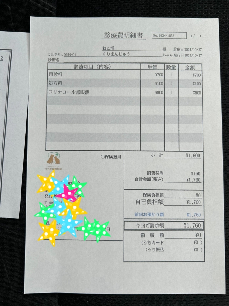 20日に一度病院にいっていただきコリナコールを処方していただいてますが、まだ目やにが出てきたということで心配してくださり、病院に連れていっていただきました。