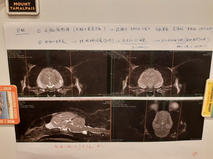 愛護センターから9月19日にお迎えしています。職員もなにかが変という認識があり、ねこ活にきました。立っていられずすぐ転がるということ、排尿排便はそこら辺にしてしまい、そのまま寝てしまう。そんな話を聞き、センターの帰り道に病院に行き、麻痺や、変形性関節症と言われましたが今までの経験からそれではない何か。を疑い、6日後に別の病院へ。脳に何か異常があるのではないかと検査を進められ、検査ができる系列病院にてX検査、MRI検査、神経学検査、便検査をしました。