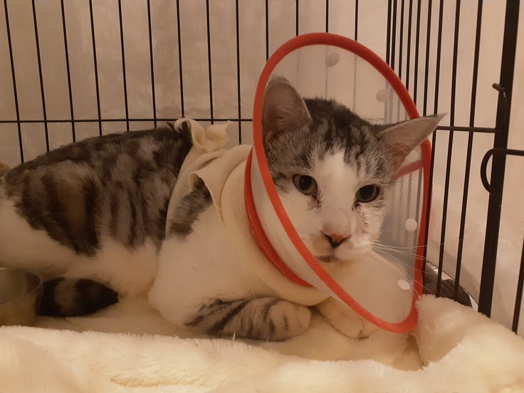 センターから迎えてその足で耳の後ろ下の手術をしています。前回鼓膜手前に肉芽腫が見つかっており投薬をしていましたが、今回手術に強い病院にて手術をする話になっています。