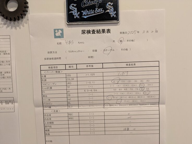腹部エコーではモヤモヤとした浮遊物があったものの尿検査では特に問題はなく、少し尿が溜まっていたというくらいでした。
