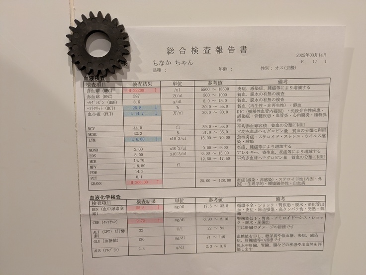 腎臓は腎不全とかの悪い段階ではなく点滴にて脱水解消すれば。。ということで点滴をいただいてきました。