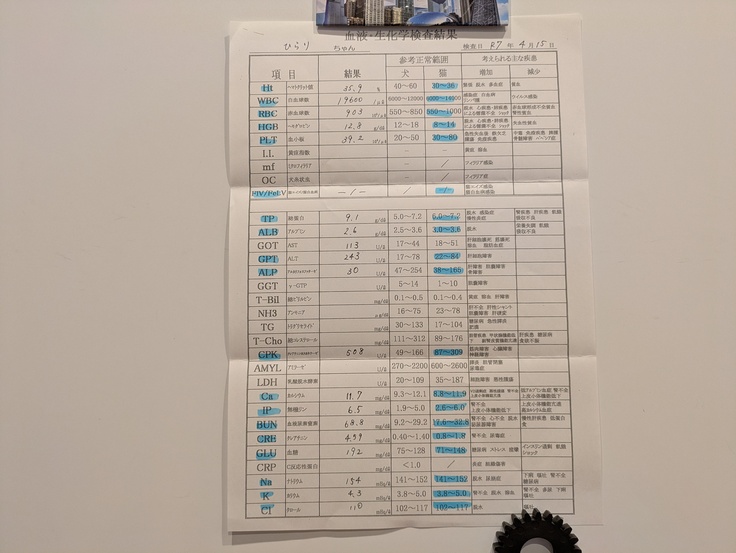 センターから引き出したあとその足で病院へ。血液検査をしましたら更に腎臓と肝臓の数値が悪くなっていました。