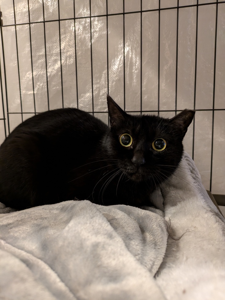 そして同じ日にお迎えした姉妹の黒猫[きらりちゃん]。3〜4才。黒猫でみんまるおめめが特徴的です。