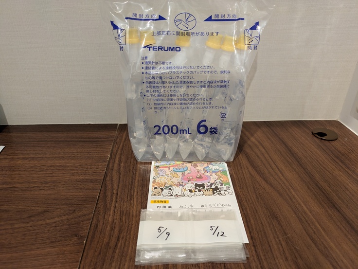 腎臓の投薬は1日2回ラプロス、輸液は1週間に1本200ミリリットルをしていきます。