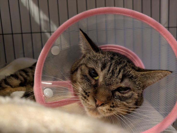 ねこ活に来た当初はかなり目が潰れた状態でしたが避妊手術と同日に瞼眼癒着手術を受けていました。