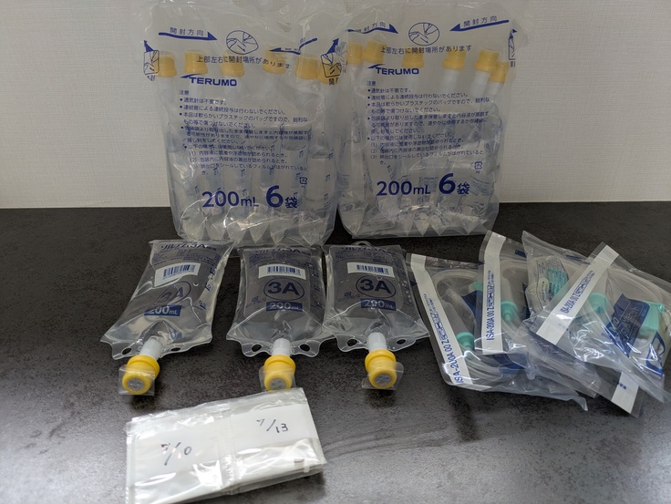 抗生剤と、まもなく輸液が無くなりそうなので15パック処方していただきました。輸液はおよそ2カ月程の量です。
