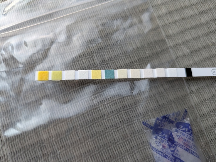 先週、病院からいただいていた[ちゃいろちゃん]の尿検査キット。2回尿をとって調べましたがやはり糖はでていませんでした。