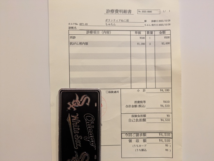 大体3週間ほどで変化がでるそうなんでが[ちゃたん君]の肥満細胞腫には変化が見られず、だからといって悪くもならずということからあと1週間抗がん剤投与をしていくことになりました。
