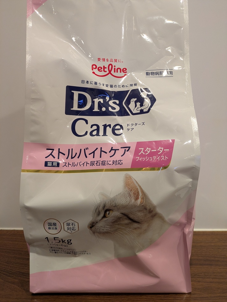 近くの病院では[ふうま君]に必要なロイヤルカナンS/Oもドクターズケアのスターターもあったので、こちらでドクターズケアのスターターを購入しました。