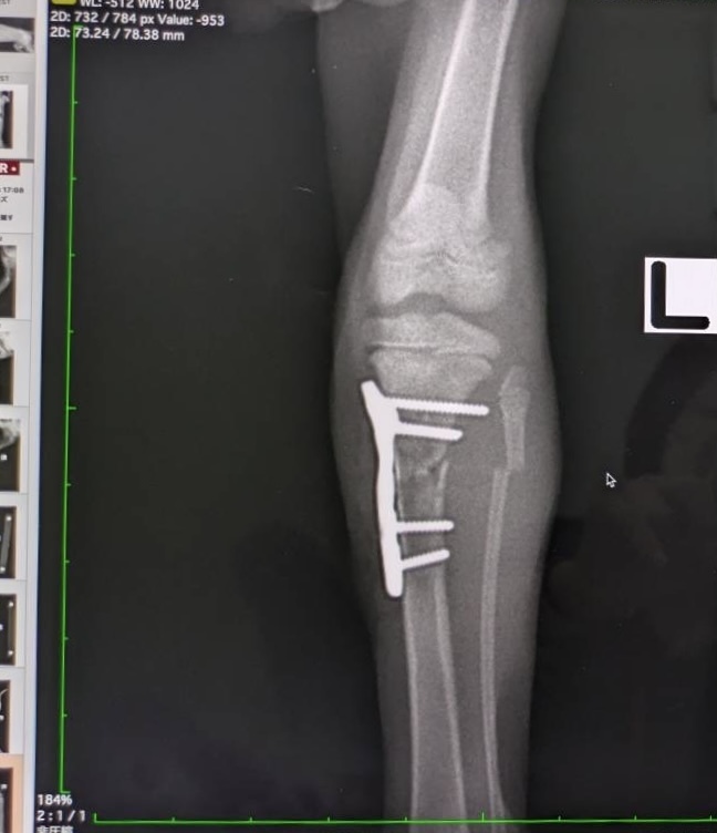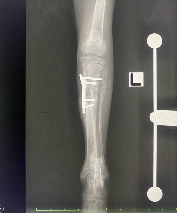 【本日】骨が太く隙間なく癒合しています。腓骨(細い方)も太く真っ直ぐになりました。