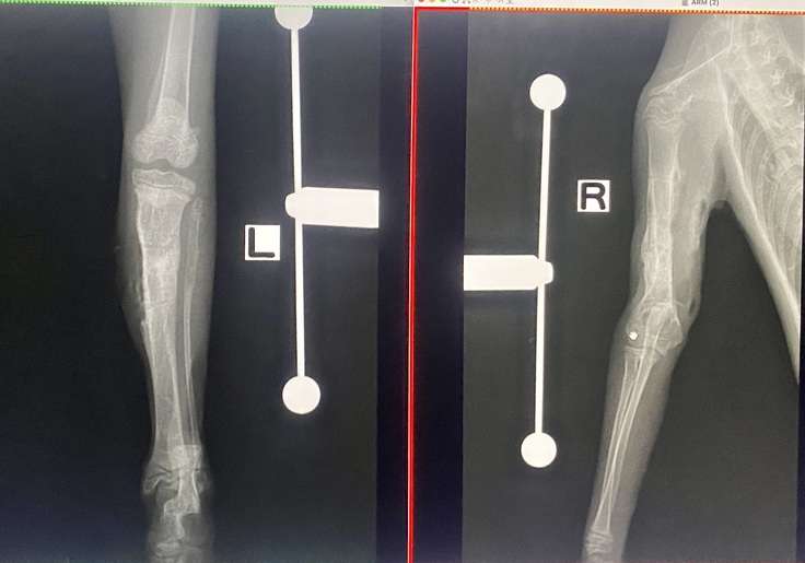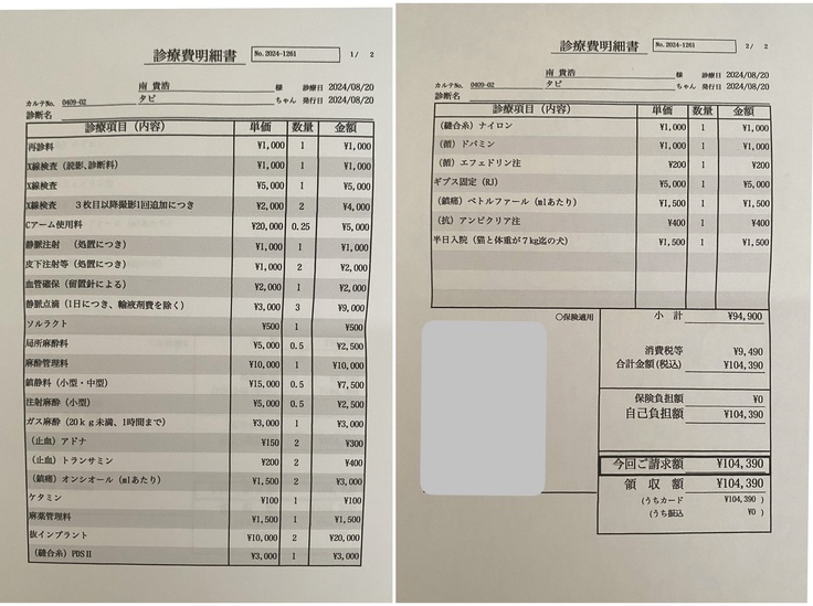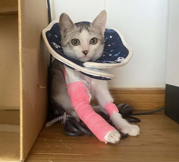 念の為腕は保定しています。そして縫合しているためしばらくカラー装着です。