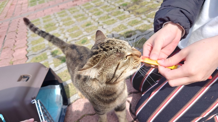 さっそくちゅーるをあげながらナデナデし、油断したところを抱っこしてお尻からキャリーにIN!