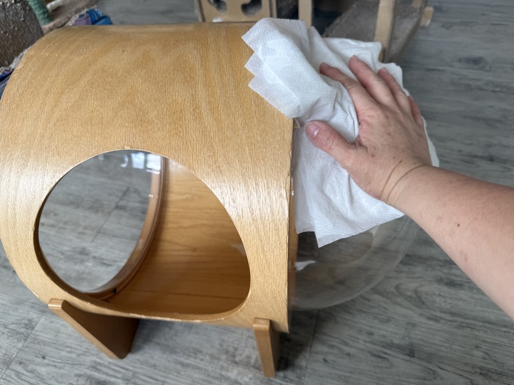 お客様関連が終わると猫達のくつろぎスペース用の座卓や水拭き可能な猫ベッドを消毒拭きあげしつつ、床やキャットタワーに汚れがないかチェックします。