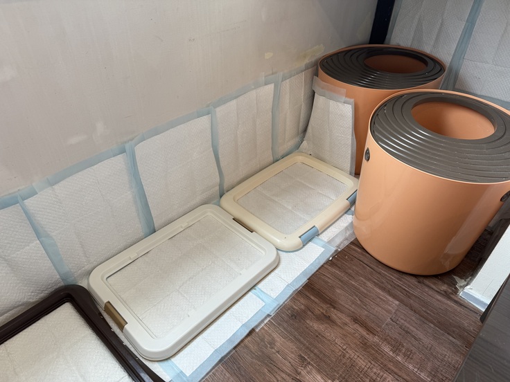 そして上がりと呼んでいる床が一段上がっているスペースにトイレが紙砂タイプが2台、ペットシーツタイプが3台設置されていて、おトイレが下手っぴさんが漏らしても大丈夫なようにトイレ周りをペットシーツで保護しています。
