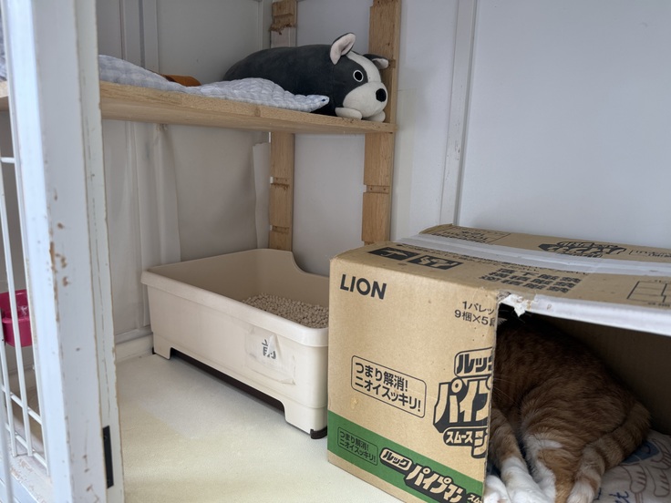 猫達がフロアに出てしまえば、各個室飲み水を回収して猫部屋(猫達の個室)のお掃除開始です!