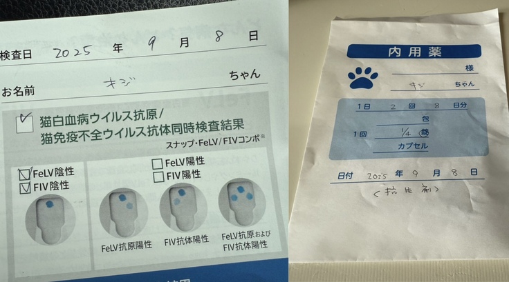 FeLV(猫白血病ウイルス感染症)・FIV(猫エイズウイルス感染症)ともに陰性でしたが、尻尾には貫通する怪我があり、悪化すれば断尾の可能性もあります。今後も投薬と消毒でのケアが必要です。