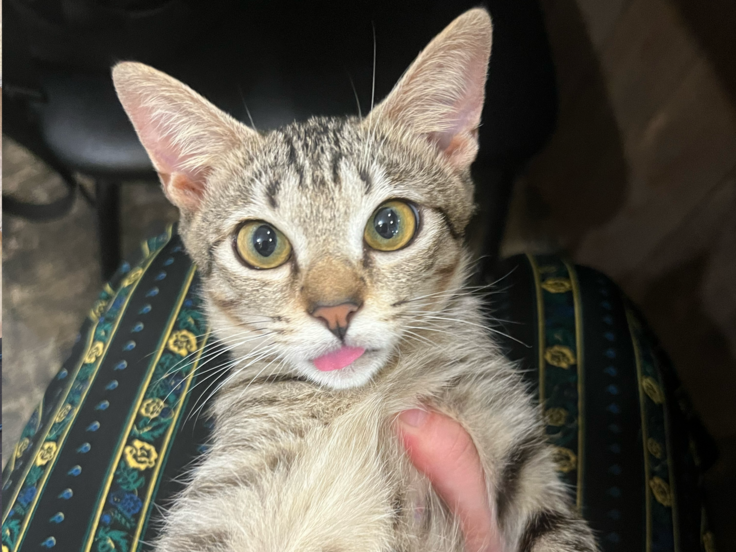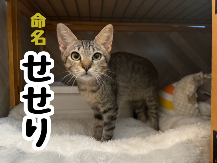 この子の柄や境遇が、保護時に尻尾を怪我していた「ささみ」に似ていたことから、鳥系の名前をいくつか考え、Instagramの投票で「せせり」と名付けていただきました。