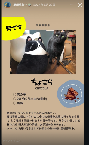 ③タップすると、ちょこらが登場!他にも里親募集中の猫たちの投稿がまとめられております。