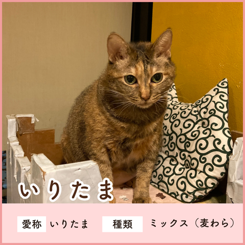 コメント:幸せをもたらすと言われている、三毛猫のオスです。お膝に乗ってくれたらい いことがあるかも!?自分で目を引っかいてしまうのでカラーをしています。