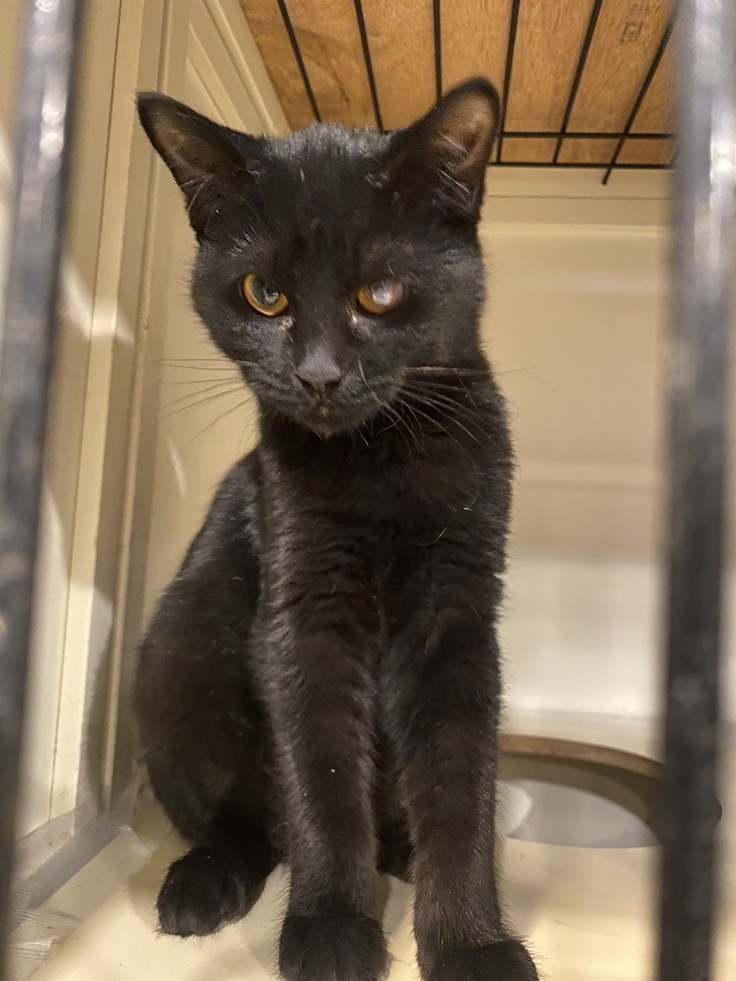 カルビちゃんは片目が白濁しています。他の兄妹より少しシャイですが丸顔の可愛い黒猫🐈⬛ちゃんです。