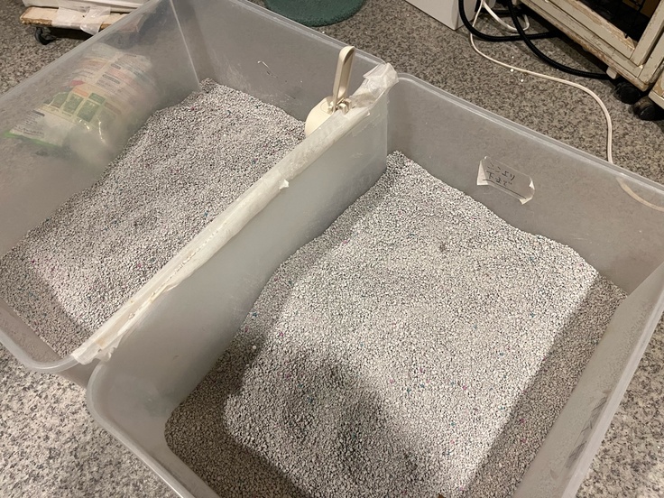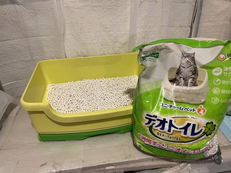 共用トイレには白玉とシート以外にも昔ながらの猫砂も使っています。