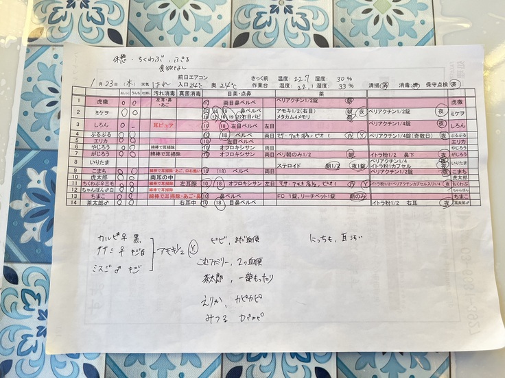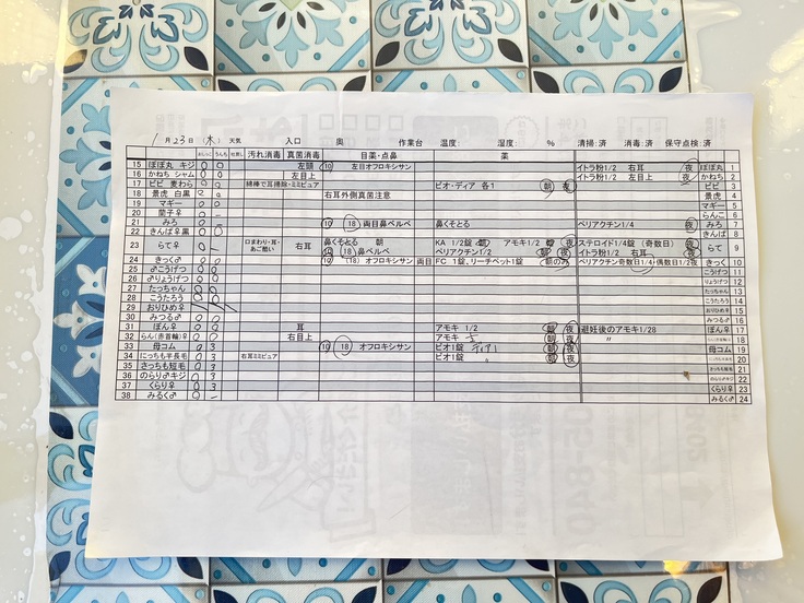 よく起こる異変を見付けた場合、速やかに店長か私に報告し投薬をするか経過観察かすぐに決めます。