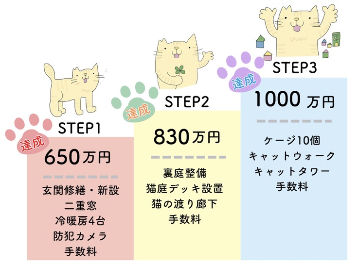 第三目標ではケージ10個、キャットウォーク、キャットタワー設置ですが、こちらはすべて問題なく実施できる予定です。