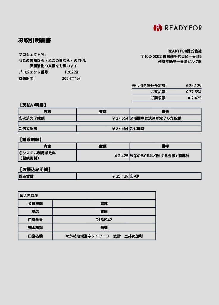 毎月継続型ご支援のクラウドファンディング 現在11名の方より毎月のご支援を頂くことになり25日付けにて2回目の入金確認とれました❣️