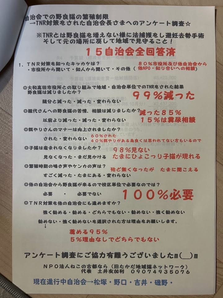 大和高田市に提出した動物愛護の要望書の際にも、TNRを実施した大規模自治会にアンケートを実施。