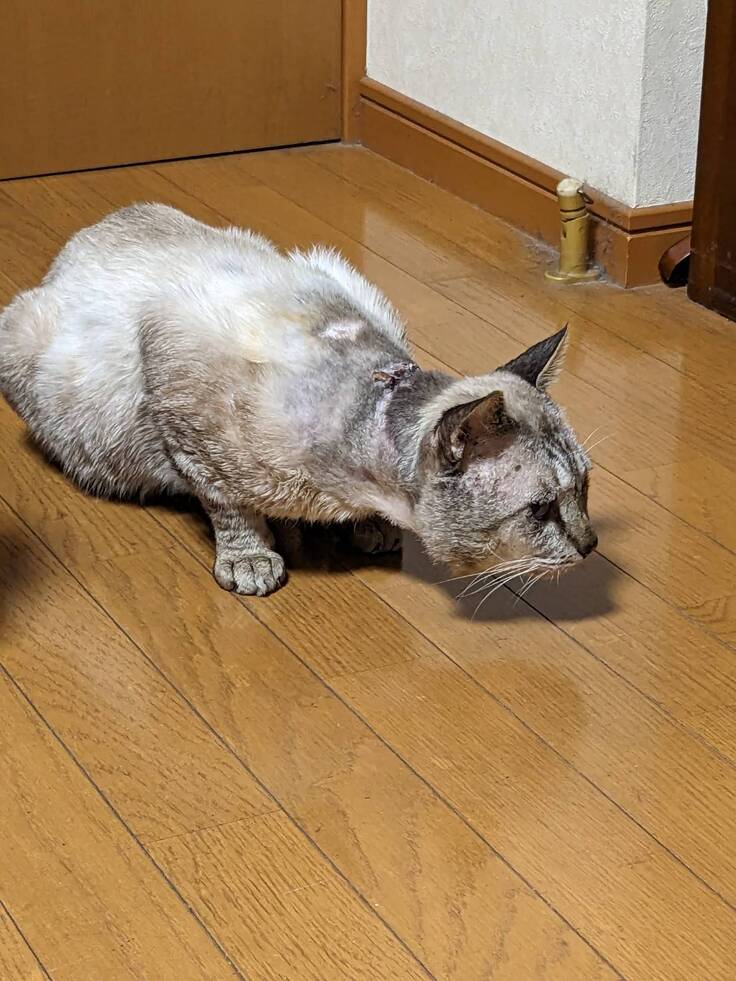 この猫は首まわりの皮膚が広範囲にわたりズル剥け、という状態ののら猫でした。