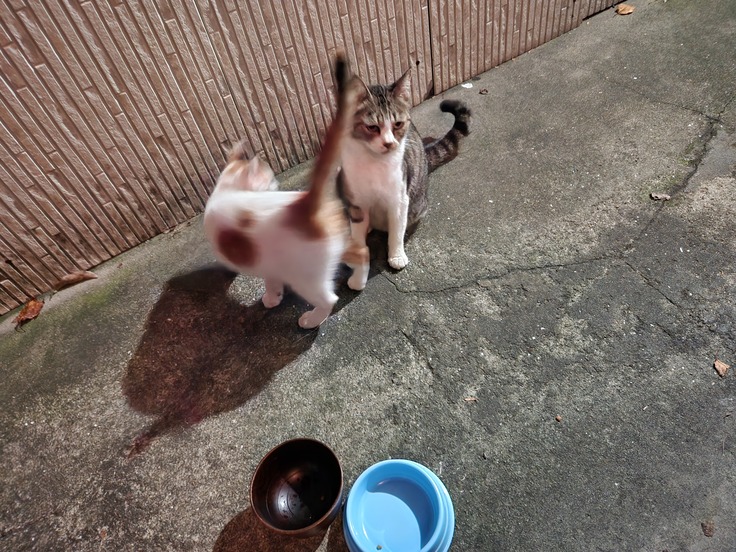 子猫は生後半年ほどで ムッチリボディの可愛らしい三毛猫ちゃん。ママさんはごつごつと痩せた背中のキジ白さん。