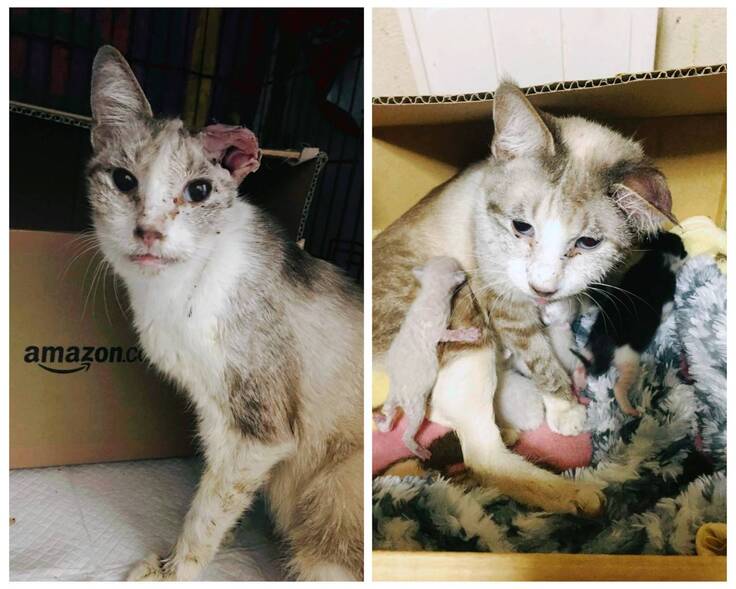 出産した親猫はろくに食べるものがなく 痩せて痛々しいながら必死に子育てをしています。