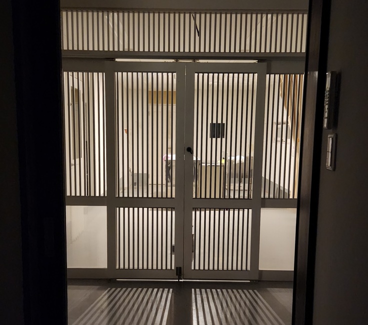 工事部がつくってくれた脱走防止柵の隙間から やわらかい明りが漏れている様子をパチリ。