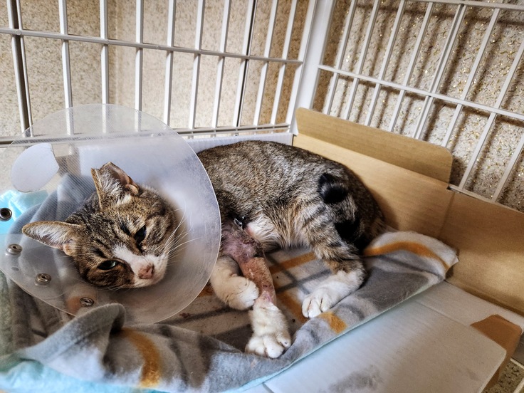 心配はしていたのですが、とうとう足をついて歩くことが出来ないケガをして、昨年の終わりころに保護となりました。骨折の疑いです💦