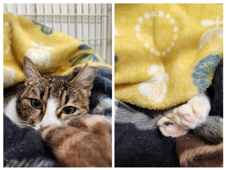 ところが、この子はシェルター内にいる猫たちを非常に怖がり、ゲージ内のベッドからほとんど出ることが出来ません。