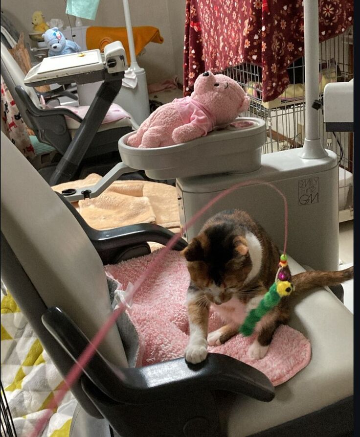 場所に慣れ始めた子達は、歯医者さんのあの椅子に登って遊び始めています。
