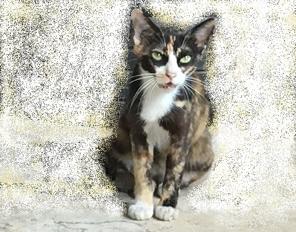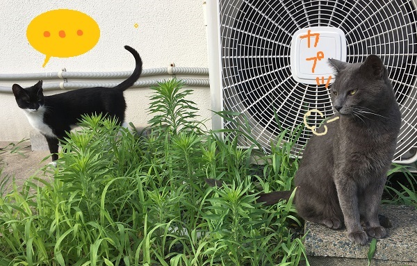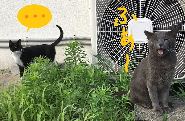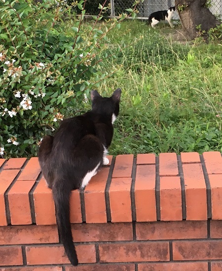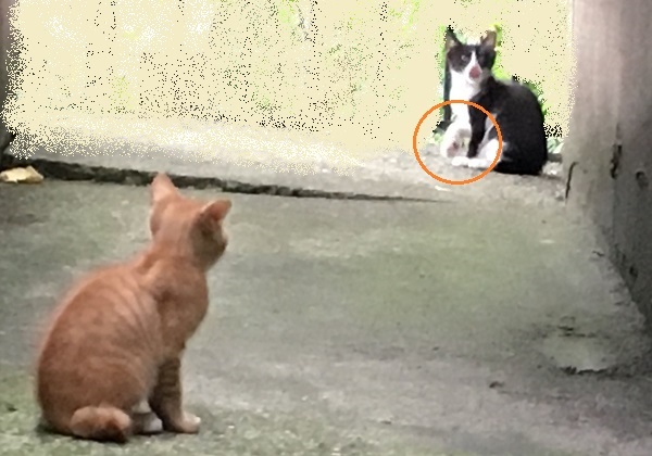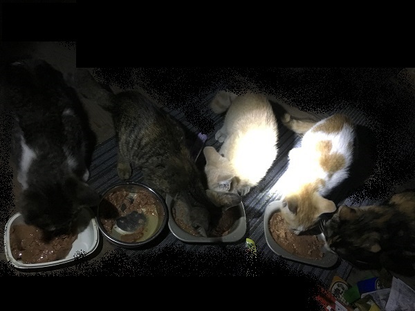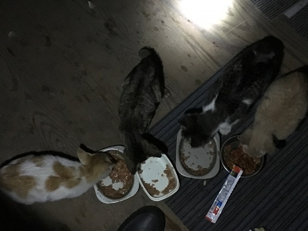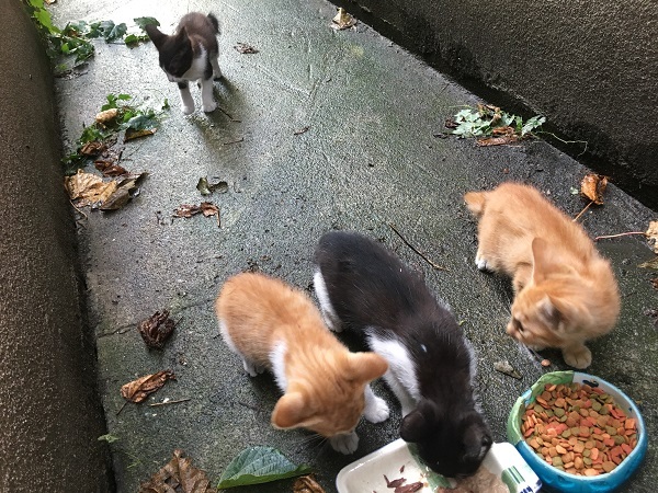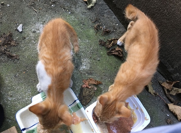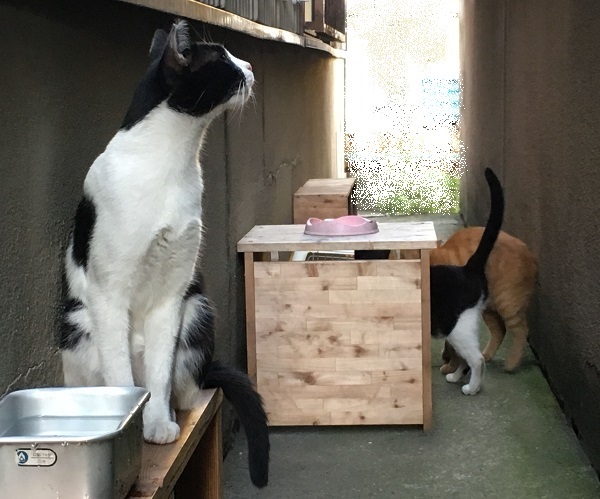 大人猫を避けながら、隙を見てゴハンを食べにくるはちわれ2匹。