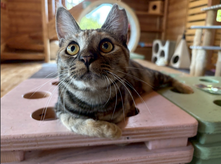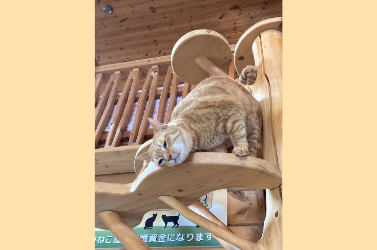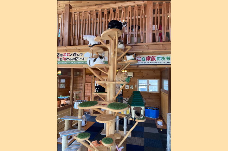 建物はログハウス建築を手がけるYSKとのつながりにより同社プロデュースで建てられたもので、店内中央には職人手作りのシンボルキャットツリーがあり、ねこ達がキャットウォークやツリーを元気いっぱいに駆け回っています。