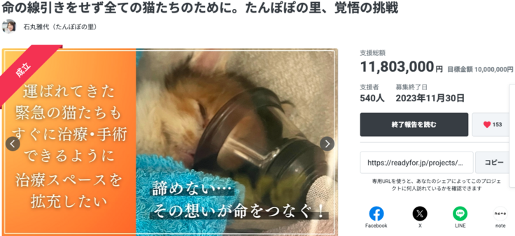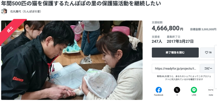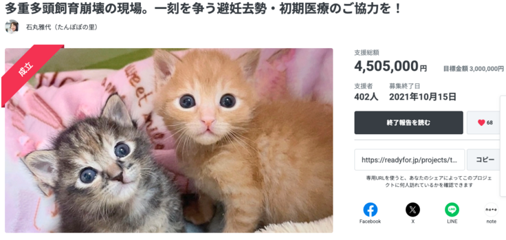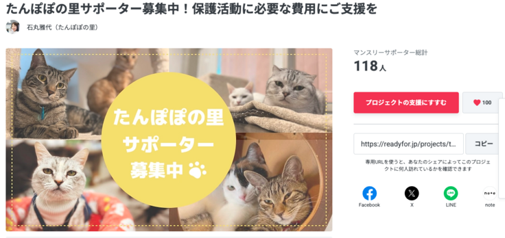 年間500匹の猫を保護するたんぽぽの里の保護猫活動を継続したい
