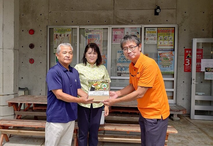 ↓世冨慶公民館の比嘉区長(左)と名護市議会の宮城さゆり議員(右)より手渡していただきました!ありがとうございます!