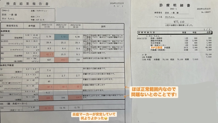 FIPについて調べていると、治療薬のおかげで元気になり寛解を迎えた子たちの話に勇気をもらう一方で、間に合わず亡くなってしまった子の話も目にします。順調に見えていたのに体調が急変してしまった子もいて、油断できない病気なんだと改めて実感しました。