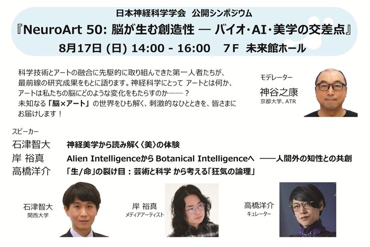 また、14-15時には研究者トーク「NeuroArt 50:脳が生む創造性 ― バイオ・AI・美学の交差点」があります。