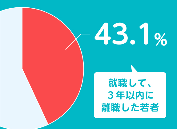 どのくらいの人が、自分の理想の仕事に就いているのか。今回はいくつかのデータをひも解きながらご紹介します。まずは、このデータ。厚生労働省から発表されている資料によると、新規で(学校を出て)就職した人の実に43.1%(※1)が3年以内にその職を辞めてしまっているそうです。就職難が言われるこの時代ですが、これだけ多くの若者が職場を去ってしまう、とても衝撃的な数値です。