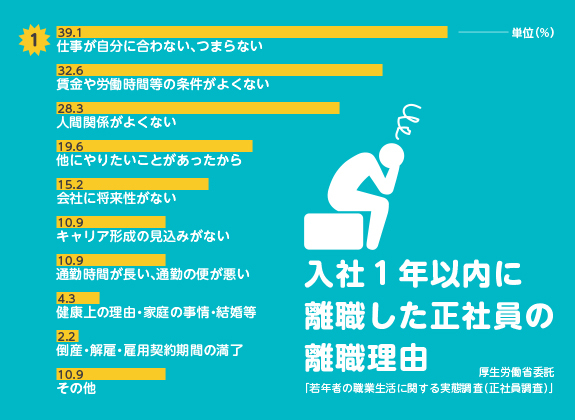 また、同じく厚生労働省にこんなデータもあります。これは、入社から一年以内に正社員が離職した際の実態調査ですが、離職理由の第一位は、「仕事が自分に合わない、つまらない」となっていて、全体の約4割の人が仕事を辞めた理由の一因(複数回答可)にあげています。確かに。あわない仕事をする毎日って、とてもつらいですよね。辞めてしまうことが、一番ポジティブな選択肢になることもあるのでしょう。