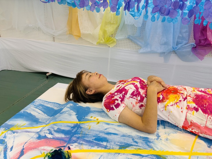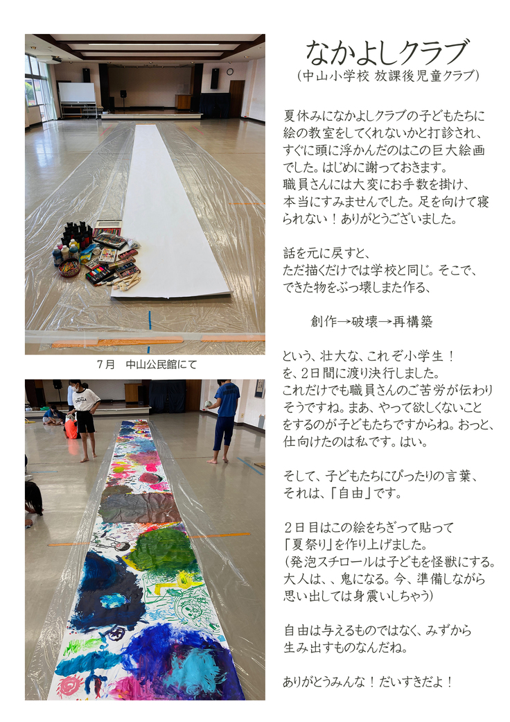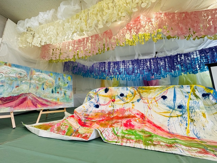 「幸せの大山」を、30分間で音楽に合わせ、縦2メートル横3.8メートルのキャンバスに力いっぱい描きました。気持ちいい!