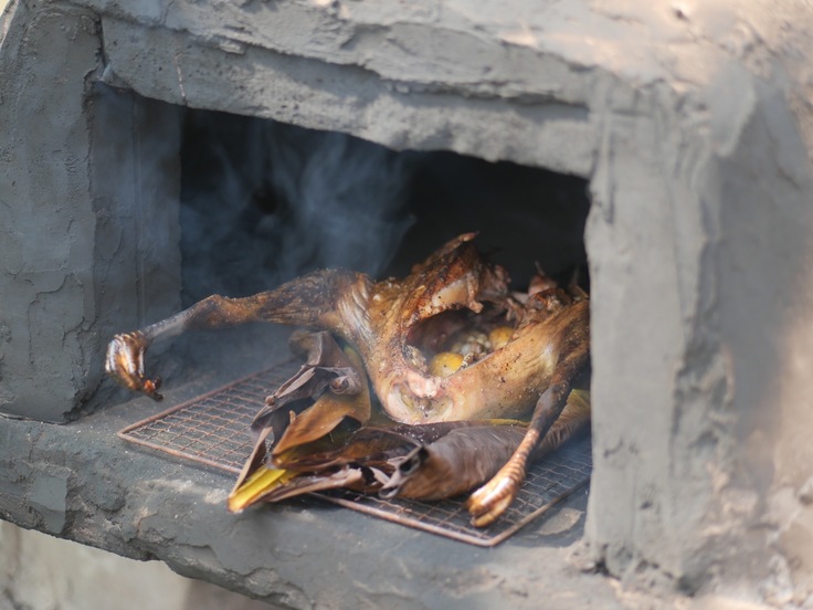 鶏の頸動脈を切り、血抜きし絞めた後、お湯に晒して羽を剥ぎます。そのあと捌いて内臓を取り出し、味付けした鶏を窯で丸焼きにして完成です。