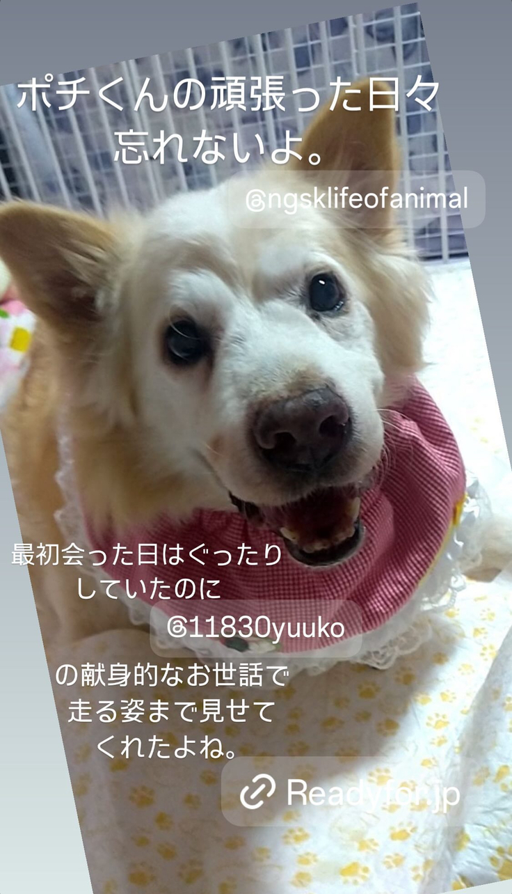 可愛い可愛いポチくん。ぐったりしてもう危ないという状態での保護。看取り覚悟でのスタッフの介護‥のはずがなんと!お庭を走り回る元気な姿を見せてくれました。