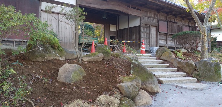 長屋門への枕木の階段は一時、取り除きましたが、やはり下から登る眺めがとてもいいので、石段として復活することにいたしました。