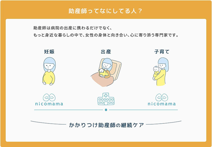 nicomamaでは、産前産後を継続して支える助産師を “ かかりつけ助産師 ” と定義し “ かかりつけ助産師 ” が暮らしのそばで心身のケアや出産・子育てに向けた準備に伴走し、親子がどのような選択をしても、一人一人が肯定され尊重される社会を浸透させます。