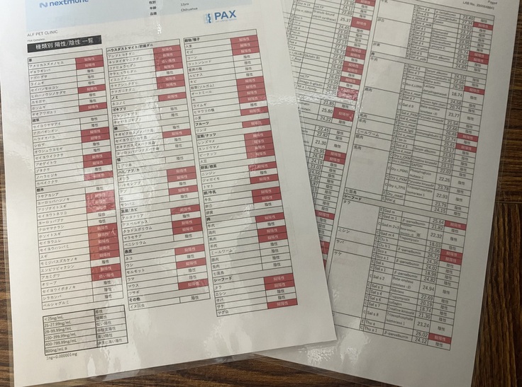 アレルギーの検査項目ほぼ全てが陽性、食べ物もアレルギーが出にくいとされるサーモン、ポテト、そしてぎりぎりチキンは食べられるのですが、それ以外はほとんど陽性であることが分かりました。